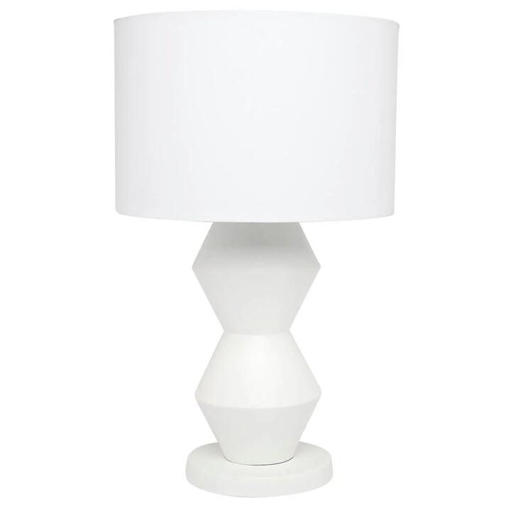 The bold lines of the Abstract Table Lamp creates a dramaticly stunning silhouette. A contemporary matte finish adorns the resin lamp base and plays on the sharp design of the form. Topped with a white linen drum shade.