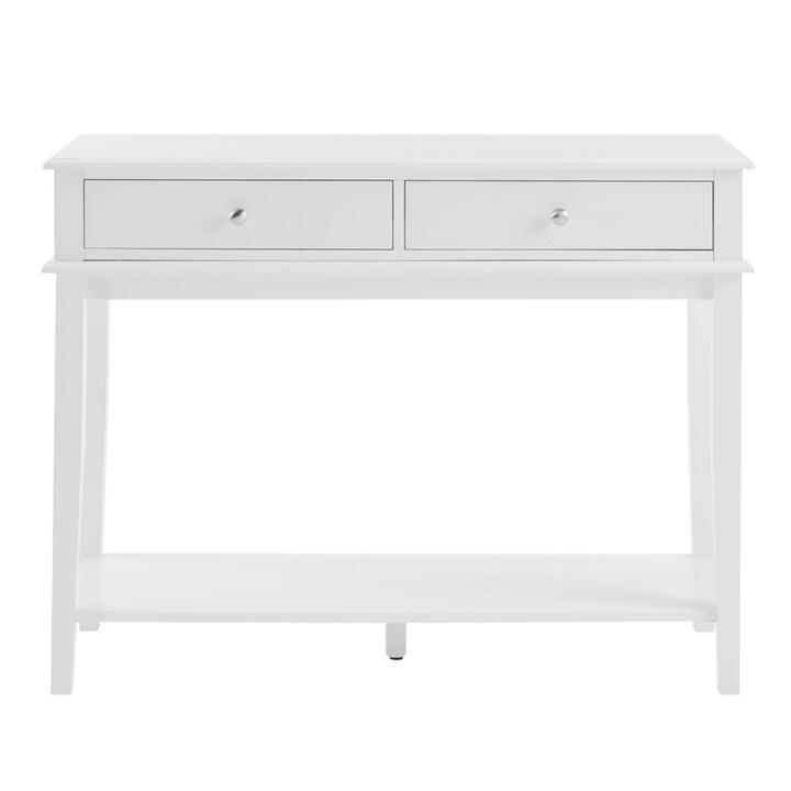 Chloe 2 Drawer Console Table is a classic, modern design that will suit any decor in your home. With 2 Drawers on metal runners and 1 open shelf, the console will give your entry or living room extra storage space. This console table is an everyday classic design built of high-quality MDF with NC painted finish. Available in 2 colours Black or White. Check if we can deliver to your postcodeOverall Dimensions: Width: 1000mm x Depth: 350mm x Height: 760mm x 21.5KgsInternal Drawer Dimensions:Width: 388mm x Depth: 238mm x Height: 65mmDrawer Front Height: 95mmInternal Shelf Dimensions:Width: 955mm x Depth: 300mm x Height: 465mmFloor to Shelf Height: 100mmAssembly Required Available online only